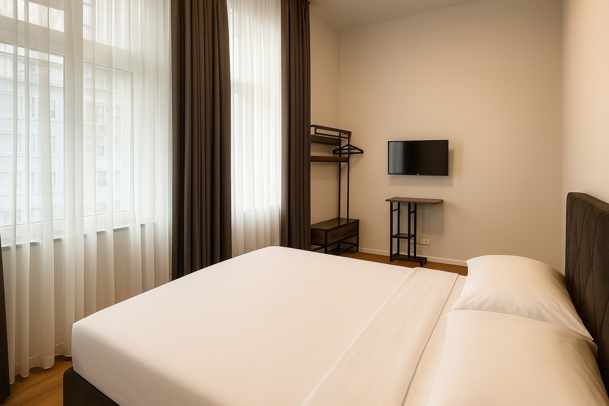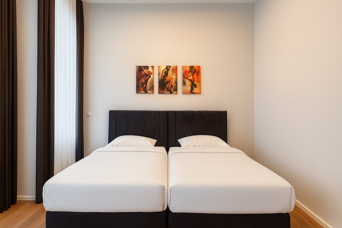 Genießen Sie erholsame Nächte in unserem modern eingerichteten Zimmer. Ausgestattet mit einem komfortablen Doppelbett, stilvollem Interieur und allen Annehmlichkeiten für einen angenehmen Aufenthalt. Perfekt für Paare oder Geschäftsreisende, die Wert auf Komfort und eine zentrale Lage legen.